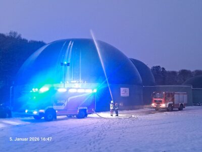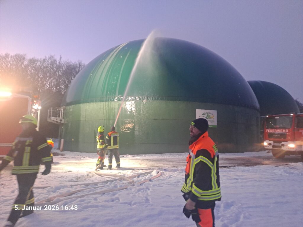 Dort hatte sich witterungsbedingt eine Eismasse auf der Planenhaube eines Restgärbehälters gebildet und die Haube eingedrückt. Bei leichtem Schneetreiben drohten weitere Niederschläge diesen Prozess auszuweiten, was schlussendlich zum Kollabieren der gesamten Haubenkonstruktion und in der Folge zu einem unkontrollierten Methanaustritt geführt hätte.